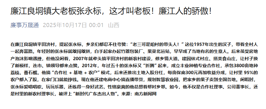 2012年,年过五十的张永标又 “折腾” 起来,成立丰业种植专业合作社,承包3800亩地种荔枝、番石榴。他搞 “合作社 + 基地 + 农户” 模式,后来还推出土地入股分红,每亩保底300元再加收益分成,让村里 95%的农户都入了股,在家门口就能挣钱。现在他还建电商中心搞直播带货,规划智慧农业园,把家乡的果子卖到全国各地。闲暇时,张永标爱唱唱歌、玩玩乐器,还练得一身好武艺,性格豪爽的他总想着帮衬乡邻。