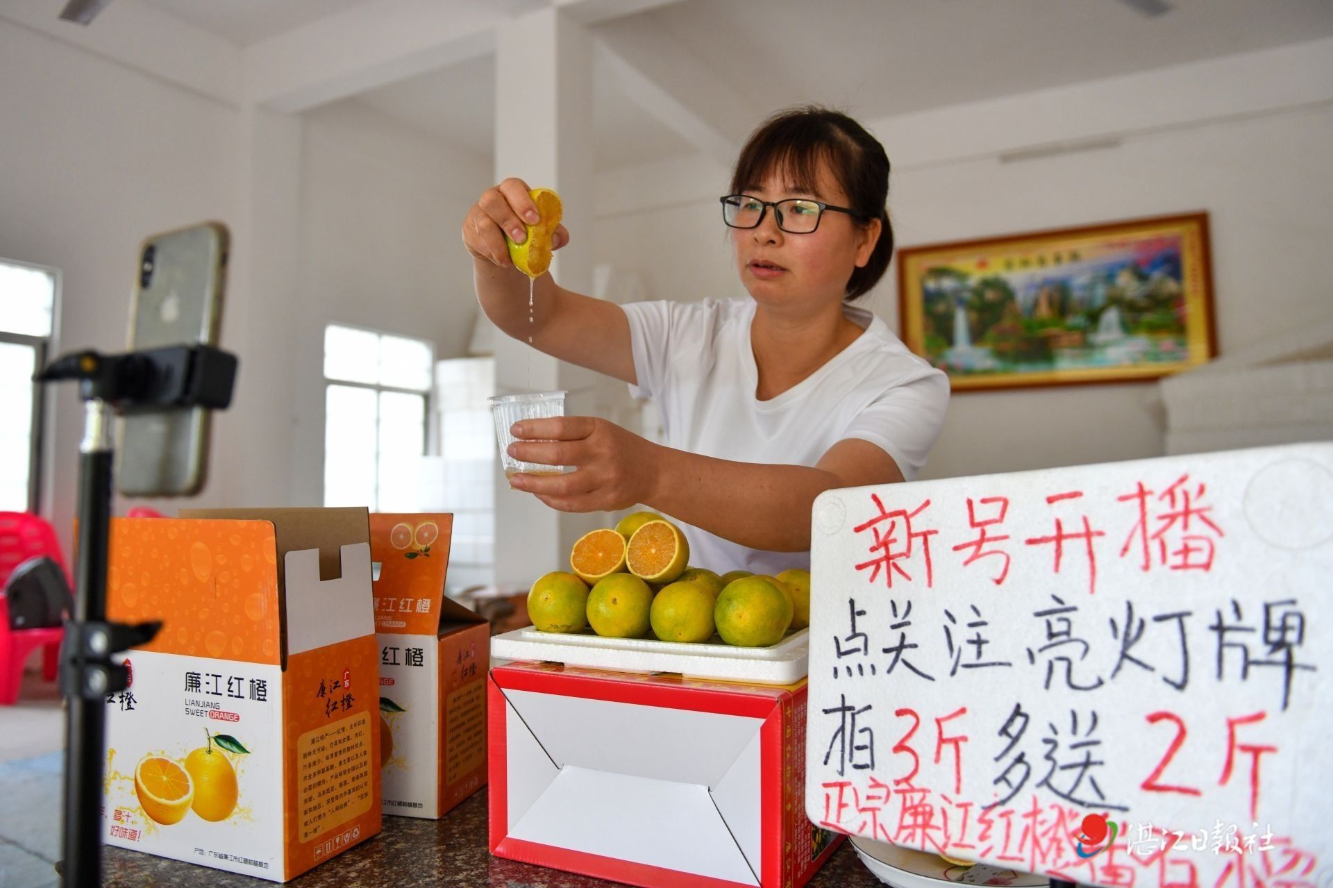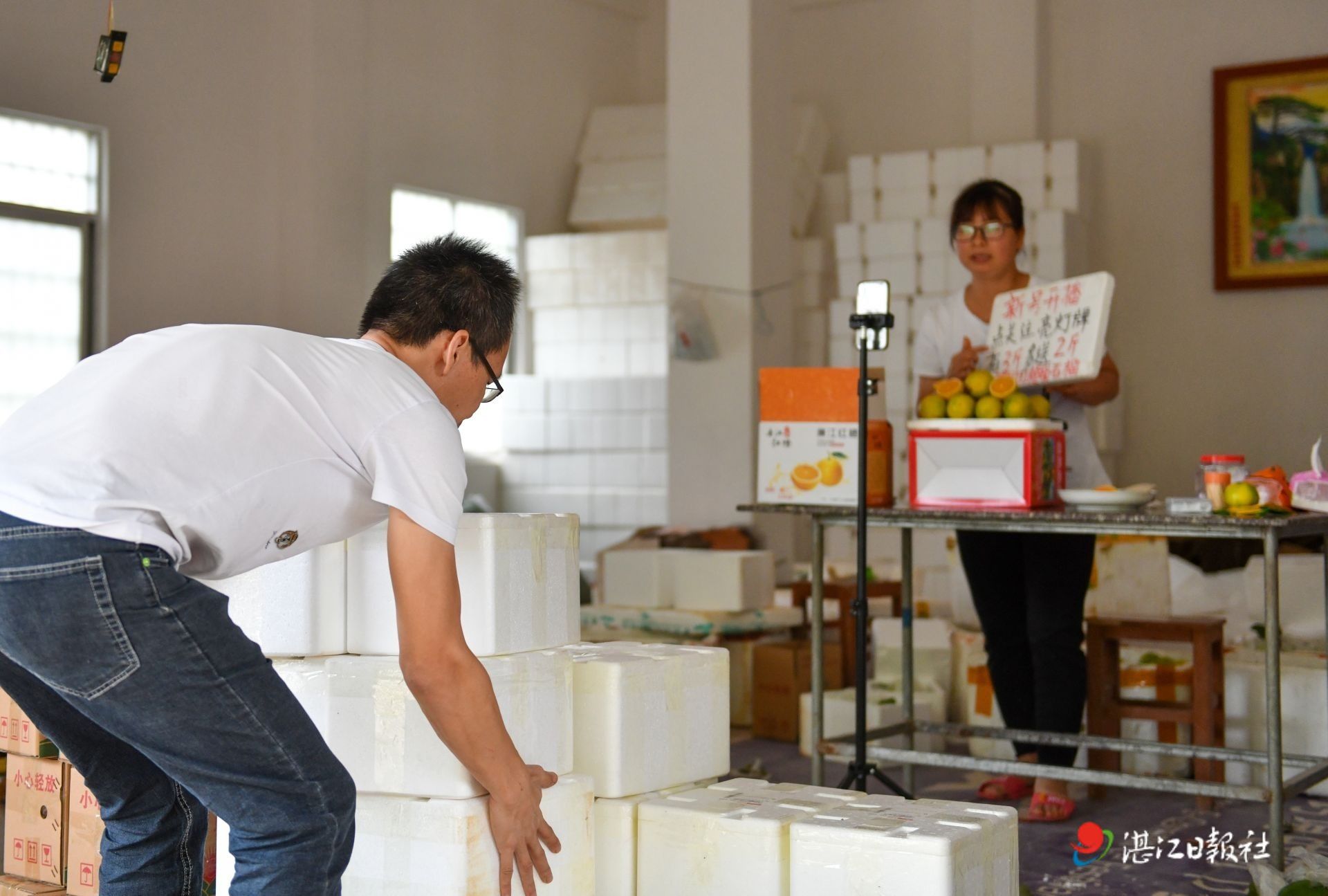 11月4日下午,廉江市良垌镇平田济村,返乡青年肖淑燕在仓库内直播销售刚上市的廉江红橙,她的弟弟则在一旁打包装箱准备发货。