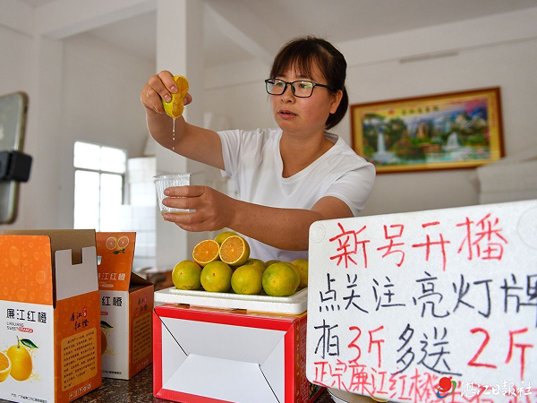 11月4日下午,廉江市良垌镇平田济村,返乡青年肖淑燕在仓库内直播销售刚上市的廉江红橙,她的弟弟则在一旁打包装箱准备发货